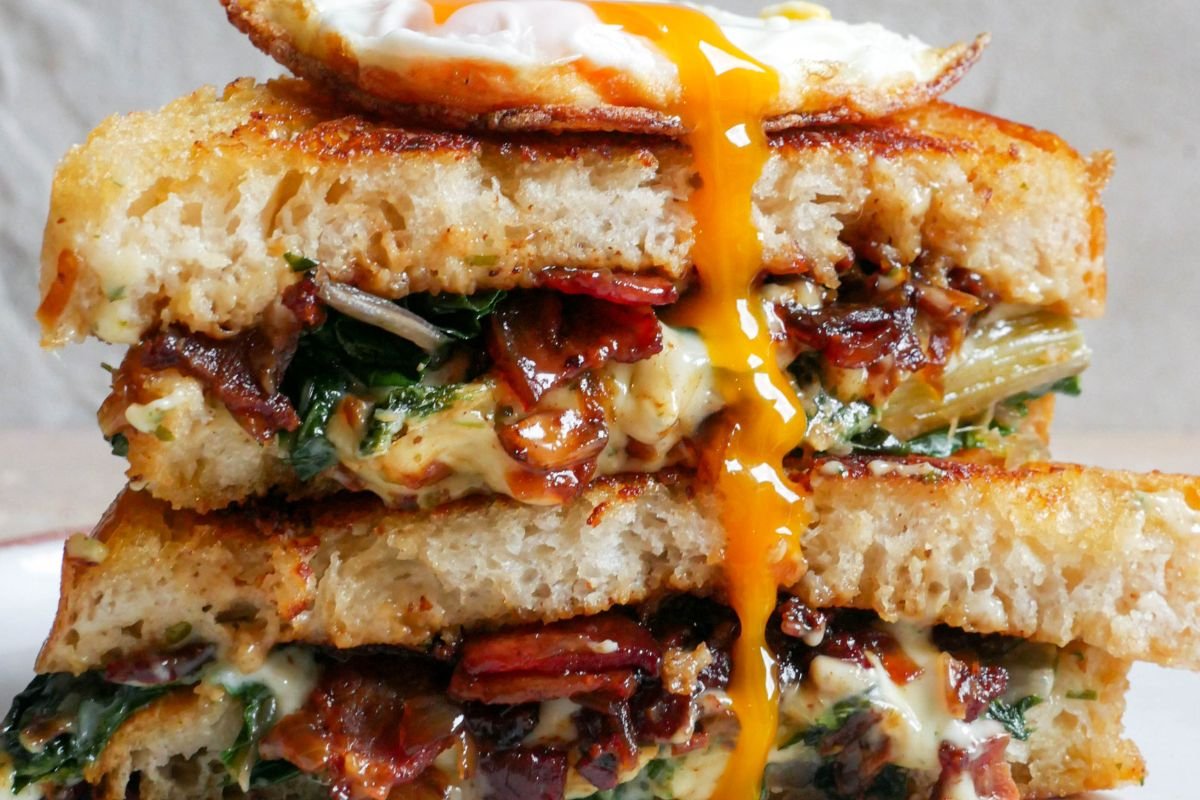 This breakfast toastie is rich, cheesy and sweet on the inside while golden and crunchy on the outside. I have jazzed up every breakfast element. Instead of plain bacon, I have made a sticky and sweet bacon jam that even includes a shot of coffee! The greens are sautéed in lots of olive oil and garlic and the egg has been fried to crispy perfection!”