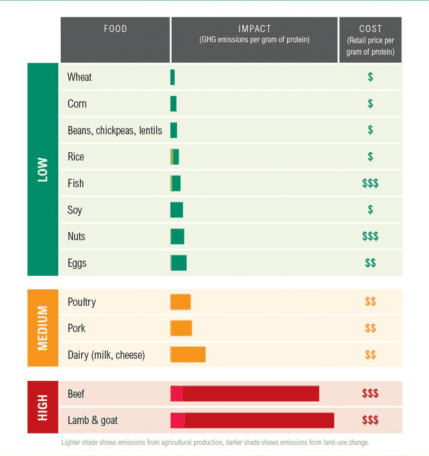 To give you an idea, the below “scorecard” from the World Resources Institute illustrates the differing GHG emissions per gram of protein from both animal and plant-based protein foods.