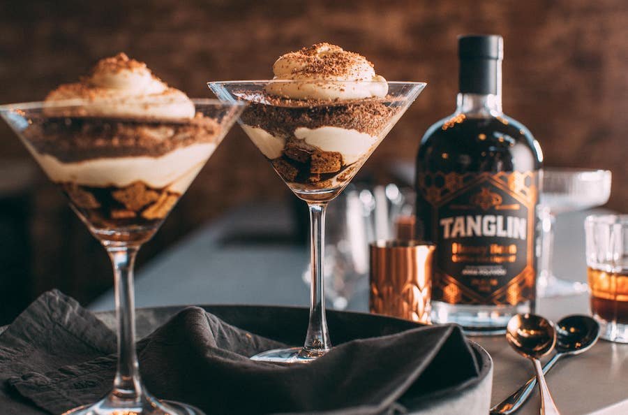 - Divide chopped Savoiardi among 6 serving glasses and pour 1tbs of the Tanglin Honey Bean Coffee Gin Liqueur over the biscuits in each glass. Top each glass with a generous spoon of mascarpone.