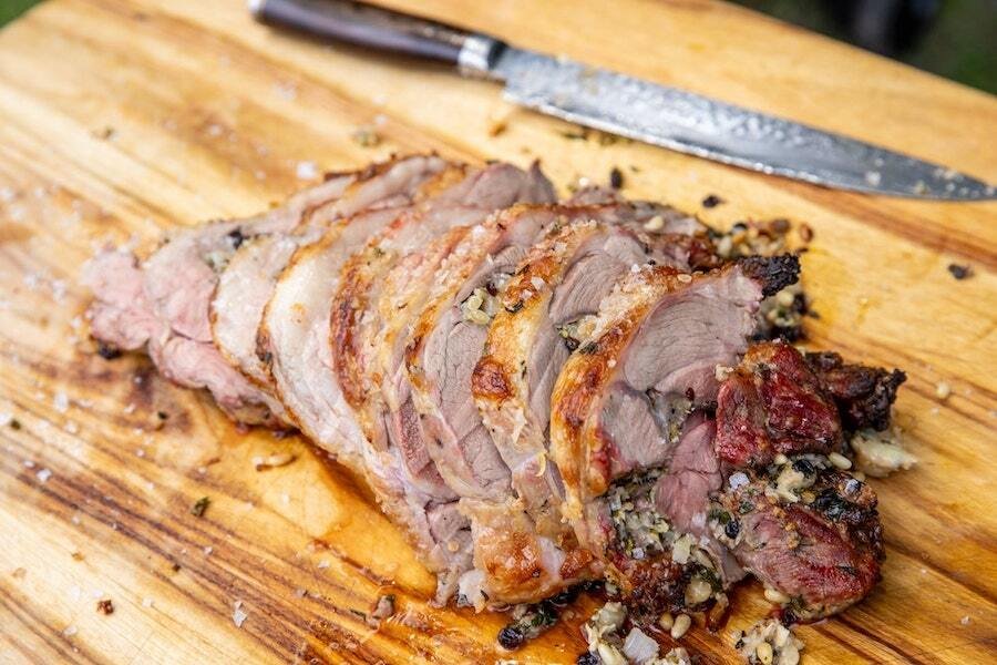 Place deboned lamb, fat side down, on a chopping board. Place stuffing in the middle along the whole length inside the lamb. Roll lamb from one side to the other. Tie with string along the length of the rolled up leg at three centimetre intervals. Rub with oil and put in a large roasting tin.