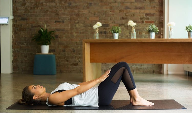 - Continue the lift as your shoulders rise up off of the mat and allow the palms of your hands to slide towards your knees. Go as far as you feel comfortable.